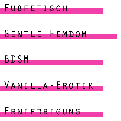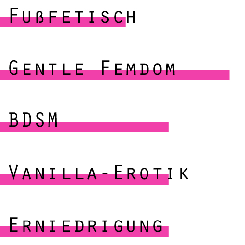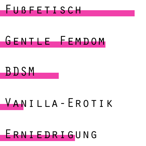 Mit Charme oder mit Schmackes? Unter jedem Buch findest du eine hilfreiche Infografik – die „Lala-Skala“ – die dessen Inhalt in die Themenbereiche Fußfetisch, Gentle Femdom, BDSM, Vanilla-Erotik und Erniedrigung einteilt und dir anzeigt, wie viel davon je Buch enthalten ist.